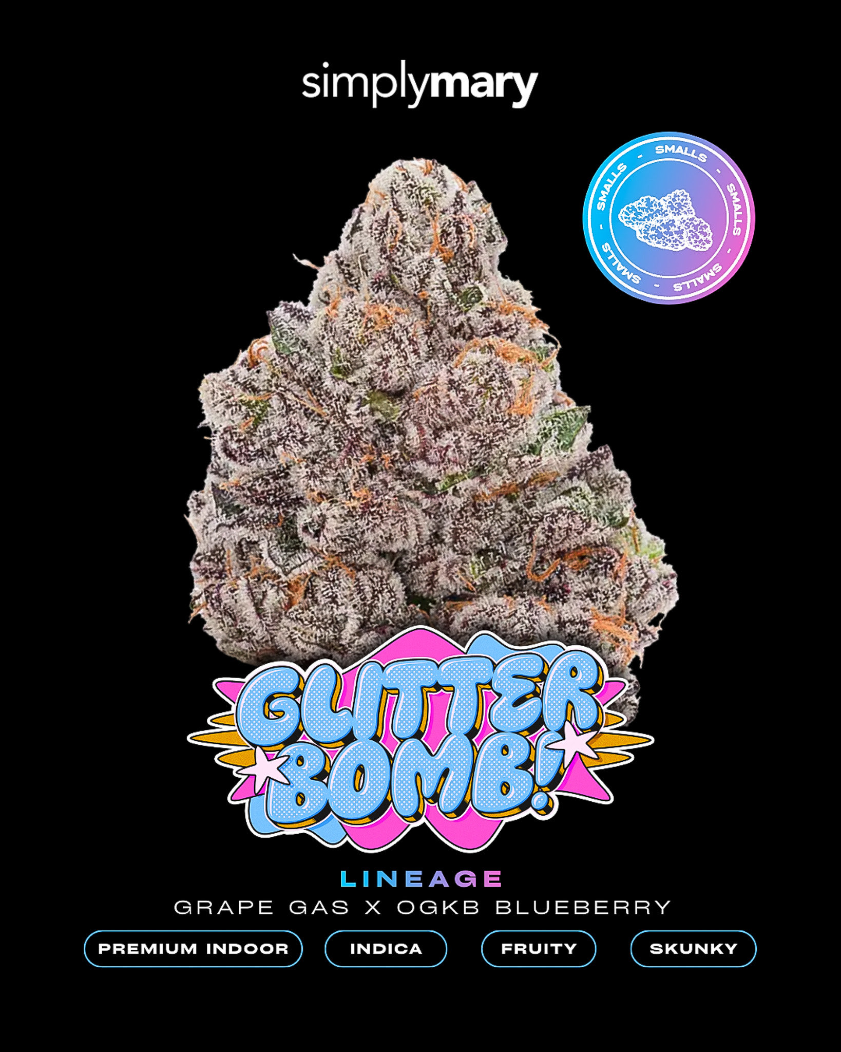 Glitter Bomb Smalls delivers an explosive fusion of Grape Gas and OGKB Blueberry. This premium indoor Indica offers a stunning mix of deep skunky funk and sweet berries in a compact, potent form.