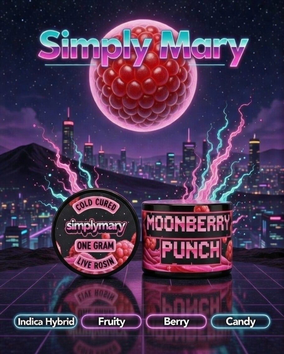 Elevate your evening with Moonberry Punch Cold Cure Live Rosin from Simply Mary. This premium Indica-dominant hybrid is a masterfully crafted solventless extract, offering a complex mixed blend of sweet berries finished with a potent, gassy punch. Cold-cured to a creamy, terpene-rich perfection, it delivers a smooth and flavorful dabbing experience that balances candy-like sweetness with deep relaxation.
